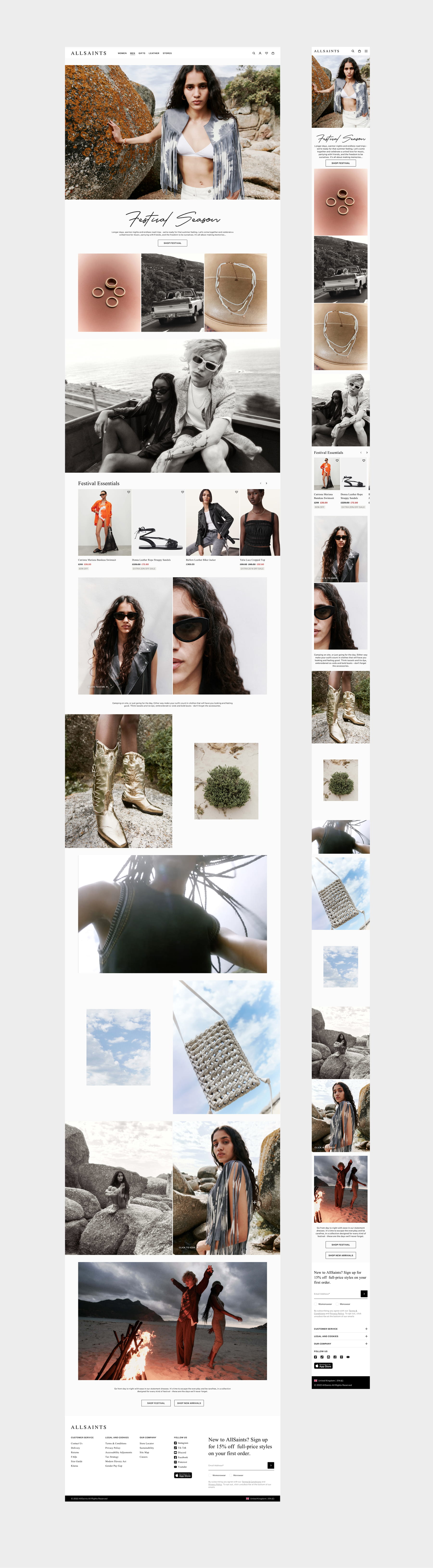 Fashion retail brand AllSaints required a bespoke festival editorial feature page for the Summer 2023 collection. The brief was to create an interactive editorial experience with functionality mirroring a product display page, incorporating features such as a ‘favourite’ button and clear, intuitive calls to action that allowed users to instantly shop products featured in the campaign visuals. To ensure a streamlined and relevant shopping journey, separate menswear and womenswear versions were developed.