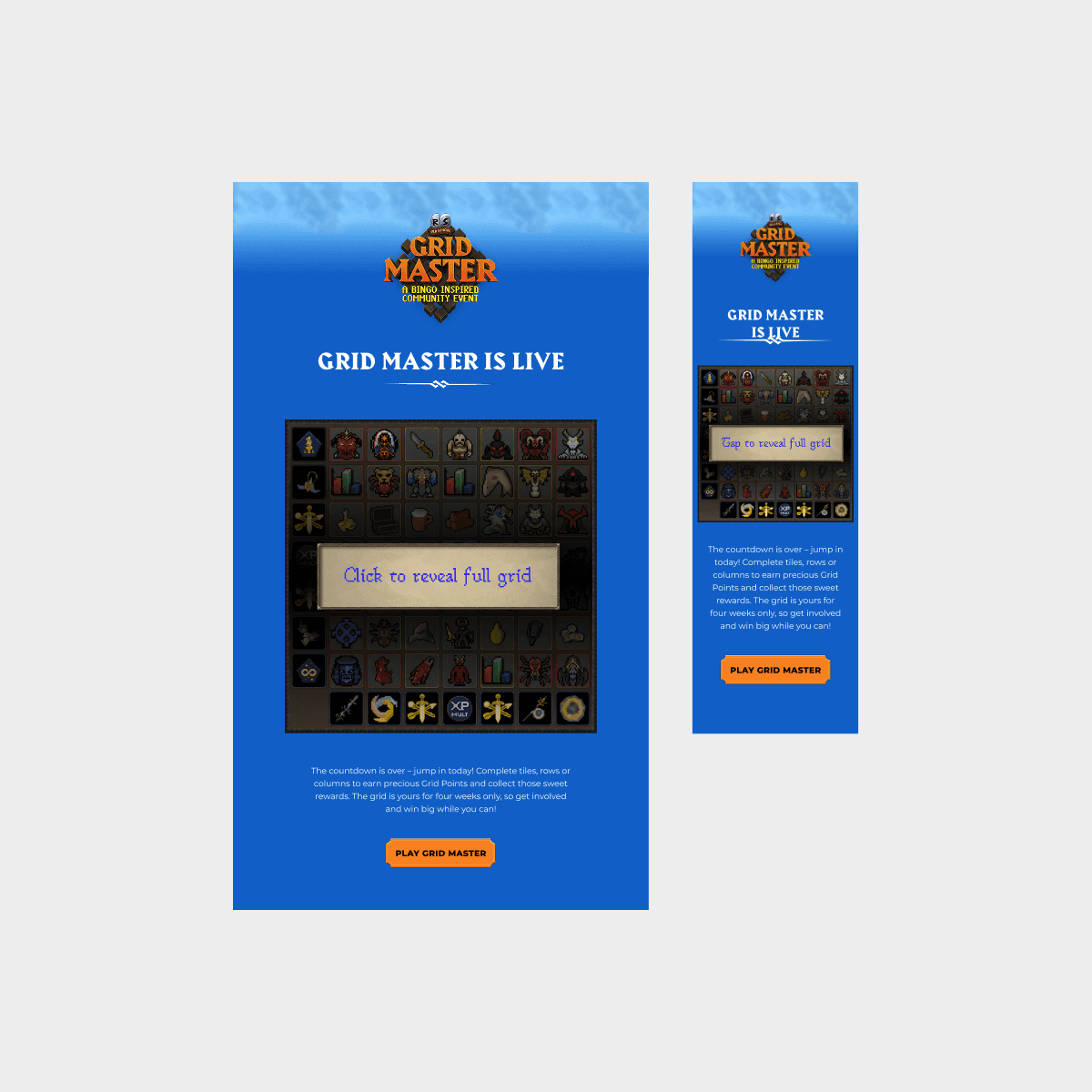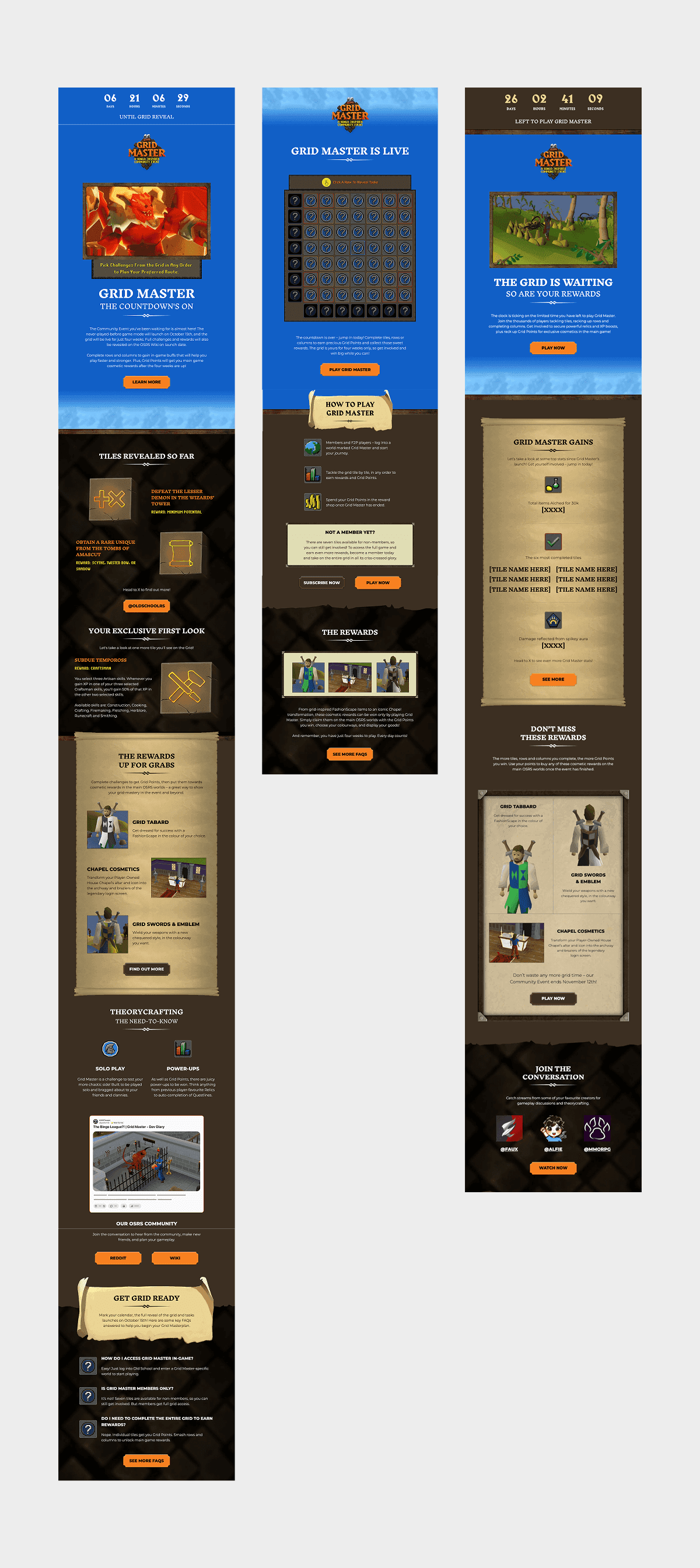 The multiplayer online role-playing game, Old School Runescape, were looking to create a new community event for their players. This event was a temporary game mode where players complete tasks to earn in-game rewards. OSRS wanted to launch a three-part email campaign to drive engagement and excitement around the event. The emails needed to be a digestible way of informing the player of the rules in a fun and engaging way. Each email had a distinct objective: Email 1: Introduce the community event. Email 2: Engage players with an interactive bingo grid showcasing tasks and rewards. Email 3: Create a sense of urgency, driving FOMO to encourage players to complete the game mode before missing out on rewards.