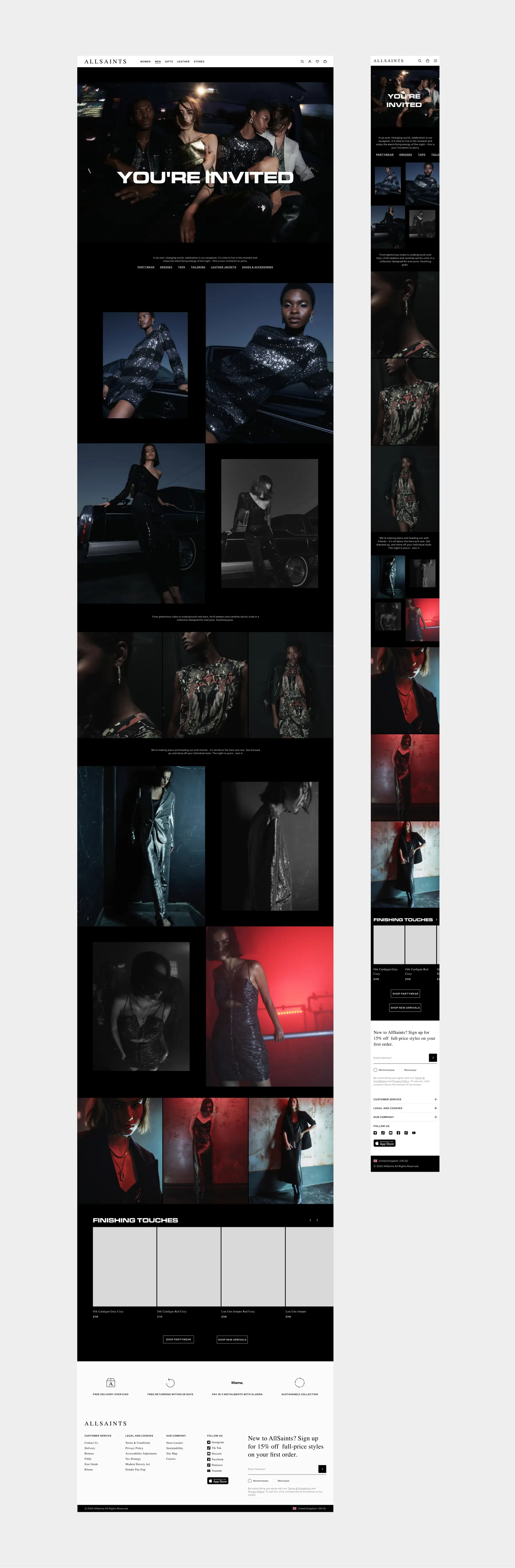 The campaign feature page was stark and cool to encapsulate the campaign’s mood premium fee and AllSaints’ brand identity. To ensure a strong mobile user experience, stackable modules and collage layouts were used. This approach prevented excessive page length on mobile while maintaining visual impact and storytelling. Clear shoppable CTA buttons and a product carousel positioned at the bottom of the page ensure that the editorial experience remains conversion-focused to blend both functionality and design.